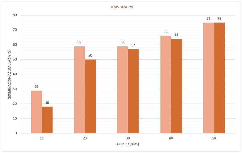 Se evaluó la germinación acumulada-en porcentaje-(número de semillas germinadas/total de semillas sembradas) y las mediciones se realizaron cada 10 días hasta los 50 días desde la siembra (dds). Se consideró que las semillas se encontraban germinadas a partir de la aparición de la radícula. A los 60 dds se evaluó la sobrevivencia ex vitro de las plantas (número de plantas que sobrevivieron luego de la aclimatación/total de plantas aclimatadas).