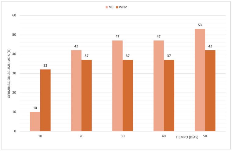 El cultivo in vitro constituye una herramienta útil para la germinación de semillas que de otra manera no sería posible [8] y favorece al proceso de mejora porque aumenta la variabilidad y la selección de individuos. Además, ofrece un medio rápido y confiable para la propagación debido a las altas tasas de multiplicación a pesar del reducido material vegetal de partida requerido, lo cual garantiza el establecimiento de plantas ex vitro durante todo el año [9, 10]. Por ello, la germinación in vitro se utiliza con éxito en varias especies y ha demostrado ser superior a otras técnicas, tales como la germinación con papel de filtro o en sustratos [11]. Sin embargo, el éxito de la germinación in vitro depende del medio de cultivo, ya que su composición tiene un rol clave en el desarrollo de las plantas [12] al proporcionar sustancias esenciales para el crecimiento de los explantes. A su vez, la respuesta de crecimiento puede resultar diferente entre los distintos medios que se utilicen. Esta respuesta se basa en la interacción de los explantes con los diferentes componentes minerales y sales, y otros elementos presentes en el medio. Estas diferencias constituyen la razón principal de la búsqueda de alternativas de protocolos basados en ambos medios para determinar las óptimas condiciones in vitro para aquellas especies vegetales que aún no han sido estudiadas [13]. El medio de cultivo utilizado con mayor frecuencia es el Murashige y Skoog (MS) [14], mientras que el Woody plant medium (WPM) [15] ha demostrado también ser un medio útil para el cultivo in vitro [12].