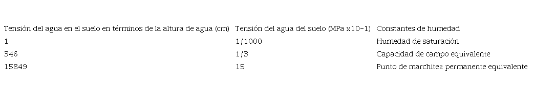 Se han supuesto puntos característicos de retención de humedad en el suelo (cuadro 1) los cuales son los siguientes: