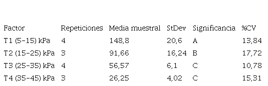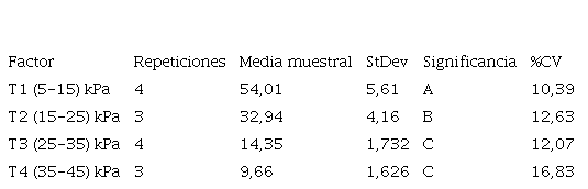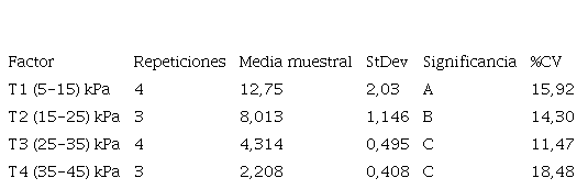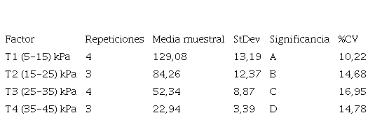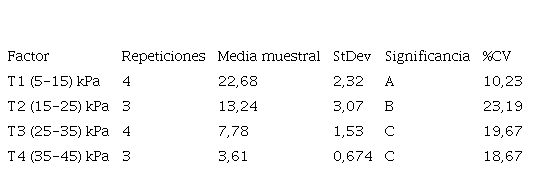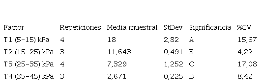 El tratamiento con el ámbito de menor succión T1 (5-15) kPa presentó la mayor productividad y concuerda con los valores encontrados en Brasil por la Empresa Brasileira de Pesquisa Agropecuária (Embrapa).
