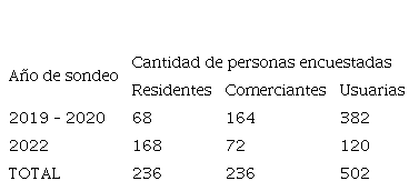 Con el fin de concretar el tamaño de las otras dos muestras utilizó el catastro del área de influencia directa (AID) de 200 m a la redonda de cada una de las estaciones de tren. Con respecto a las poblaciones residentes, no se cuenta con datos concretos de la población total que habitaba en ese momento en el AID, en especial porque la población estudiantil que vive en las cercanías de las estaciones ligadas a alguna universidad cambia frecuentemente, por ende, en este caso de decidió tratar de alcanzar la mayor cantidad de encuestas posibles. Finalmente, para el caso de la consulta a locales comerciales, la consulta se realizó al encargado o dependiente principal que se encontrara en cada local en ese momento, tratando de que se lograra tener un censo de dicha población. Como material de apoyo se contó con el catastro de las áreas en estudio y se complementó con un levantamiento actualizado de usos del suelo detallado durante el mismo período del estudio. Se debe considerar que el sondeo de poblaciones se vio interrumpido por los protocolos del COVID 19 de la Universidad de Costa Rica, por lo que la muestra se tomó en dos años diferentes. Finalmente, la composición de las muestras alcanzada se evidencia en el cuadro 1.