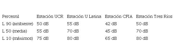 Finalmente, se evidenció que otras fuentes de ruido pueden estar alterando la dinámica de contaminación sónica de un lugar. Según [5] cuando se realizan las mediciones de ruido es importante definir el ruido residual que se pueden generar por otras fuentes (principalmente el ruido de las carreteras). También es importante definir los momentos ideales para realizar estas mediciones dado que pueden ser afectadas por diferentes variables. Los mapas de ruido también reflejaron este comportamiento; por ejemplo, en la estación UCR, donde el ruido de circunvalación representa mayores niveles sonoros que el tren.