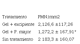 Se puede notar que la cantidad de PMN/mm2 para los animales tratados con el extracto de P.major en el día 3 es significativamente menor que la cantidad presente en los individuos tratados con solo el excipiente y sin aplicar tratamiento (ρ <0,05, Kruskal-Walis). Mientras que entre el tratamiento control con excipiente y el control sin tratamiento, el comportamiento es bastante semejante.