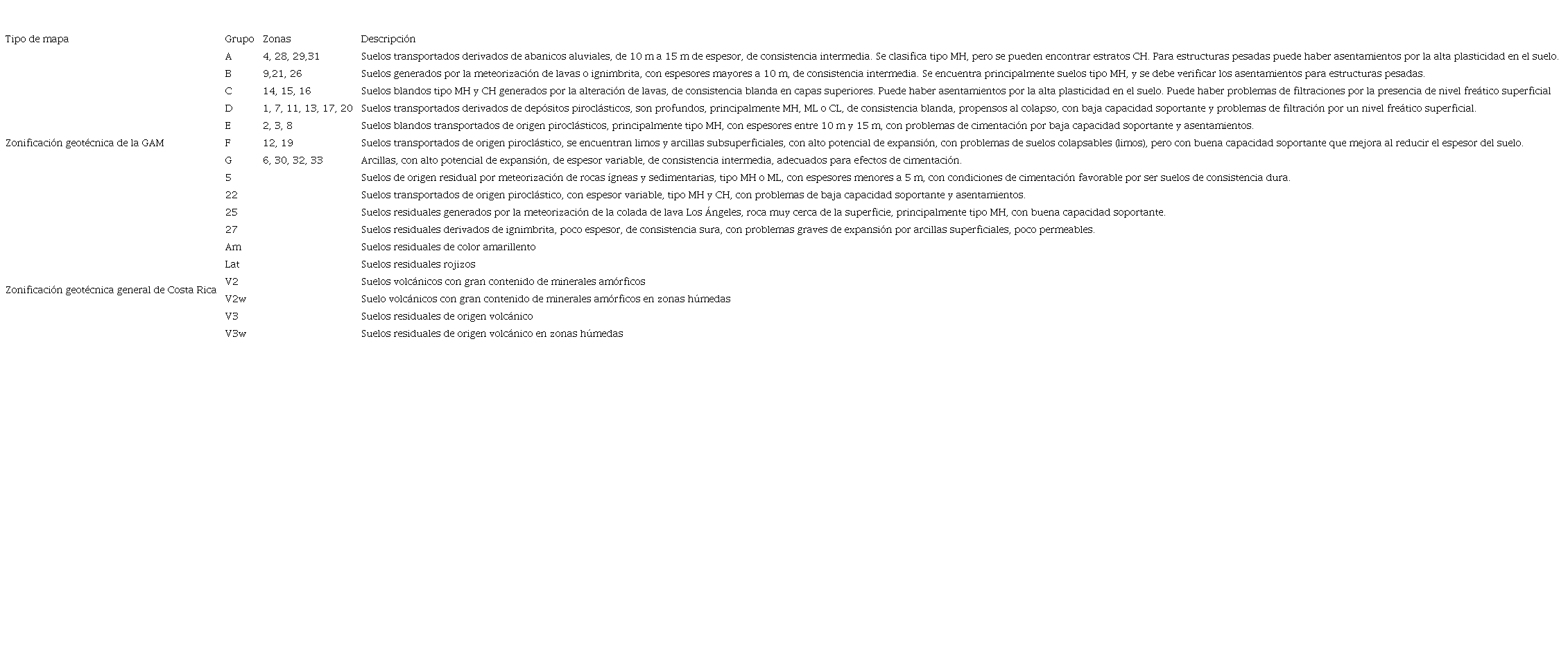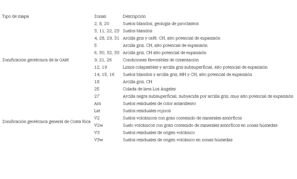 Con respecto a la geología de la zona, se usó el mapa de zonificación geotécnica que se presenta en el Código de Cimentaciones de Costa Rica [13]. Es importante mencionar que, dependiendo de los resultados obtenidos estadísticamente, puede se valoró la posibilidad de que estas zonas pudieran no coincidir luego de la revisión de datos. Se establecieron las siguientes zonas preliminarmente, mostradas en el cuadro 5 .
