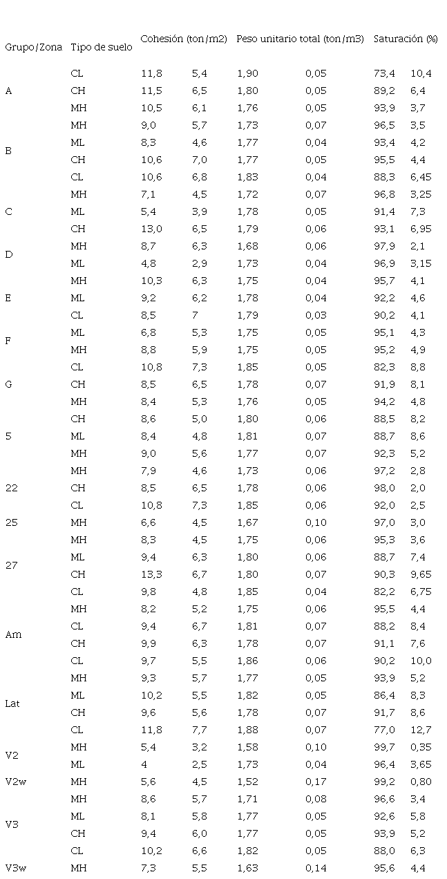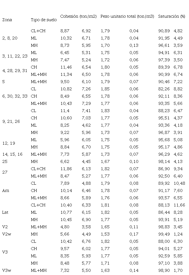 Para los parámetros estadísticos de la cohesión no drenada y del peso unitario total de estas zonas, se dividió en los tipos de suelos encontrados en la zona por medio de pruebas de hipótesis de comparación de promedios, por lo que hay zonas en las que se pudieron clasificar el suelo específicamente y en otras se obtuvo un resultado más general. Los valores analizados se presentan en el cuadro 7.