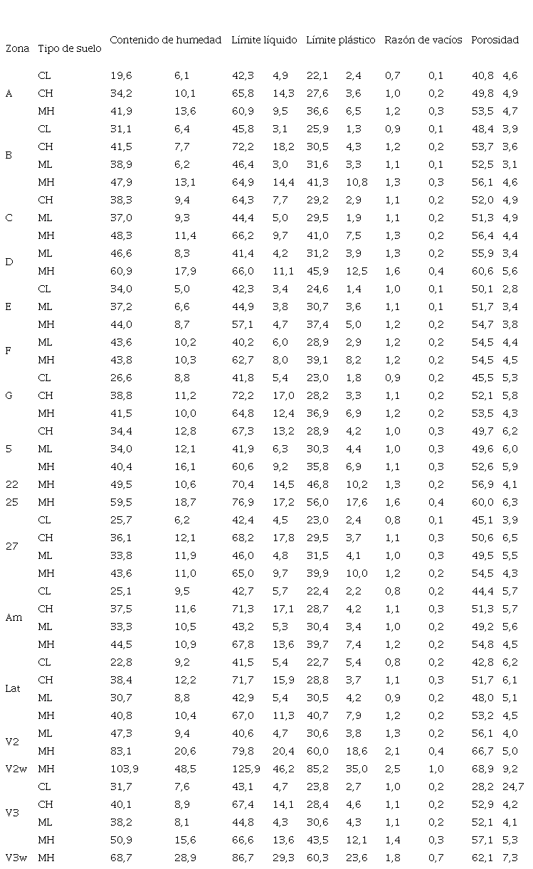 Una vez analizados los datos, se obtuvieron los promedios y las desviaciones estándar para la cohesión no drenada, peso unitario total y grado de saturación de los suelos encontrados en las provincias de Heredia y Alajuela (cuadro 10). Asimismo, se obtuvo esta información para el contenido de humedad, límite líquido, límite plástico, relación de vacíos y porosidad del suelo, la cual se muestra en el cuadro 11.