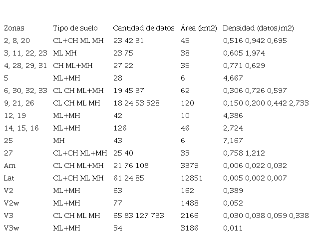 Teniendo esta zonificación en cuenta se prosiguió a obtener la densidad de los datos por área de la zona contemplada (cuadro 2). Algunos de los tipos de suelo según SUCS se unieron para tener una mayor densidad de datos en una zona de gran área y lograr de esta manera una cantidad significativa de datos. Se debe tomar en cuenta que no se combinaron arcillas y limos, y se evitó unir las arcillas de alta plasticidad y de baja plasticidad debido a que presentan grandes diferencias en su comportamiento.