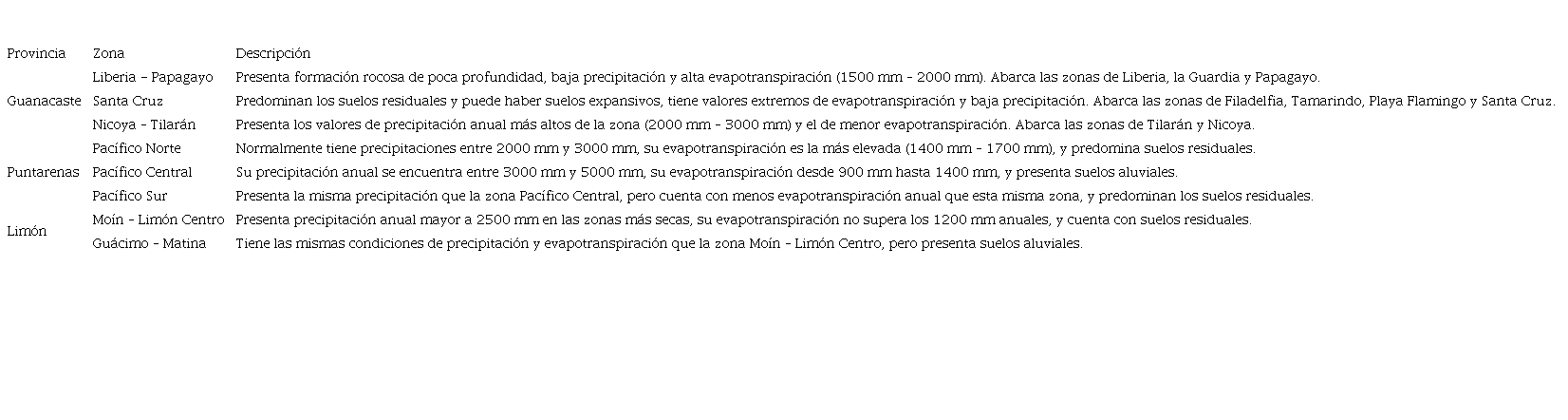 Para estas provincias se realizó una zonificación preliminar de las tres provincias, considerando los cambios en las propiedades físicas del suelo por su ubicación, condiciones climáticas y geología. Para las condiciones climáticas, se utilizaron los mapas de precipitación promedio anual y evapotranspiración promedio anual establecidos por el Instituto Meteorológico Nacional (IMN) [17], como se presenta en la Figura 15 (Pacífico Norte), Figura 16 (Pacífico Central), Figura. 17 (Pacífico Sur) y Figura 18 (Vertiente del Caribe).