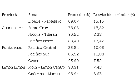 Es necesario notar que para las provincias de San José, Cartago, Heredia y Alajuela el análisis efectuado consideró solo los puntos recolectados de la GAM, por lo que puede haber áreas, donde es posible que los estadísticos presentados no representen adecuadamente las condiciones in situ.