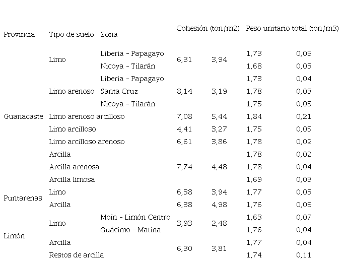 Como resultado de la investigación realizada se presentan los valores de promedio y desviación estándar de diferentes parámetros geotécnicos para los suelos hallados en Costa Rica. Para algunas provincias se tienen estos datos estadísticos para la cohesión no drenada, peso unitario total y grado saturación del suelo, mientras que otras cuentan con información adicional para el ángulo de fricción efectivo. Esta situación indica que hay suficiente información para realizar un análisis estadístico tanto para un diseño geotécnico a corto plazo (condición no drenada) como para largo plazo (condición drenada) para algunas regiones nacionales.