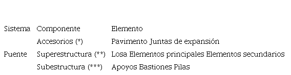 (1)•Componente: Los componentes representan una clasificación o agrupación conceptual de los elementos de un puente. Cada componente a su vez considera una ponderación de los elementos que incluye, considerando la evaluación y peso de cada elemento. La suma de los pesos de los elementos es igual a 1.
