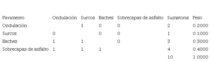 Como ejemplo de la utilización del Método Delphi, se presenta el análisis de los daños por evaluar en el elemento pavimento del componente accesorios. Se evalúan ondulación, surcos, baches y sobrecapas de asfalto, no se evaluará el agrietamiento. En la figura 2 se presenta el análisis.