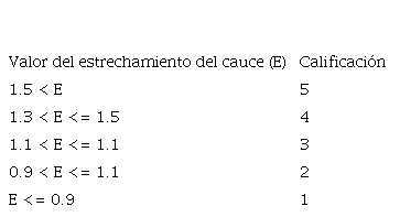 Posteriormente se calcula el estrechamiento del cauce, este cálculo se toma del informe del proyecto de extensión “Priorización de estructuras de puentes utilizando indicadores de desempeño. Plan piloto Municipalidad de El Guarco. 2018-2019”, realizado por este grupo de investigación, realizando una adaptación a las condiciones que el inspector pueda observar durante la inspección visual de daños.