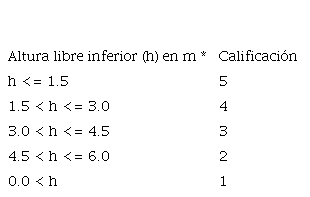 El otro elemento que se analiza es la altura libre inferior de la estructura, esto permite analizar la capacidad hidráulica de la misma. Este dato es medido durante la inspección en campo. En el cuadro 3 se observa la escala de valoración.