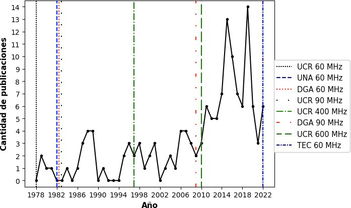 El artículo más antiguo encontrado en las bases de datos, y que utiliza el equipo de RMN instalado en el país, es de 1979. Esto muestra que desde un inicio la técnica fue utilizada en investigaciones locales, aunque es probable que existan otros estudios y publicaciones anteriores, particularmente tesis de grado y proyectos de graduación no registrados en las bases de datos consultadas.