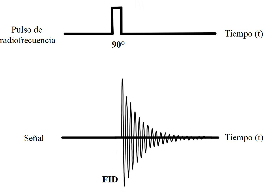A mediados de los 60’s, Richard Ernst y Weston Anderson, a partir de métodos matemáticos, iniciaron el desarrollo del método de pulsos, que simplificó el análisis de la técnica y eliminó los barridos de onda continua. Este procedimiento, a través de los fenómenos de relajación, produce el FID; el cual es analizado mediante el uso de la transformada de Fourier [73]. En la figura 1 se muestra la relación entre el pulso producido por la onda de radiofrecuencia y la señal de FID generada por la relajación de los espines.