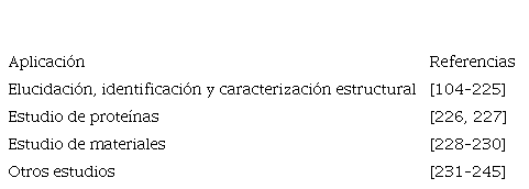 Luego de una extensa revisión bibliográfica, ha sido posible presentar las principales áreas temáticas en donde la RMN ha sido utilizada, ya sea con los equipos instalados en el país, o bien, en colaboraciones internacionales brindando asesoría y apoyo en la técnica. El cuadro 1 muestra estos resultados, con las citas bibliográficas correspondientes para una búsqueda más expedita por parte del lector.