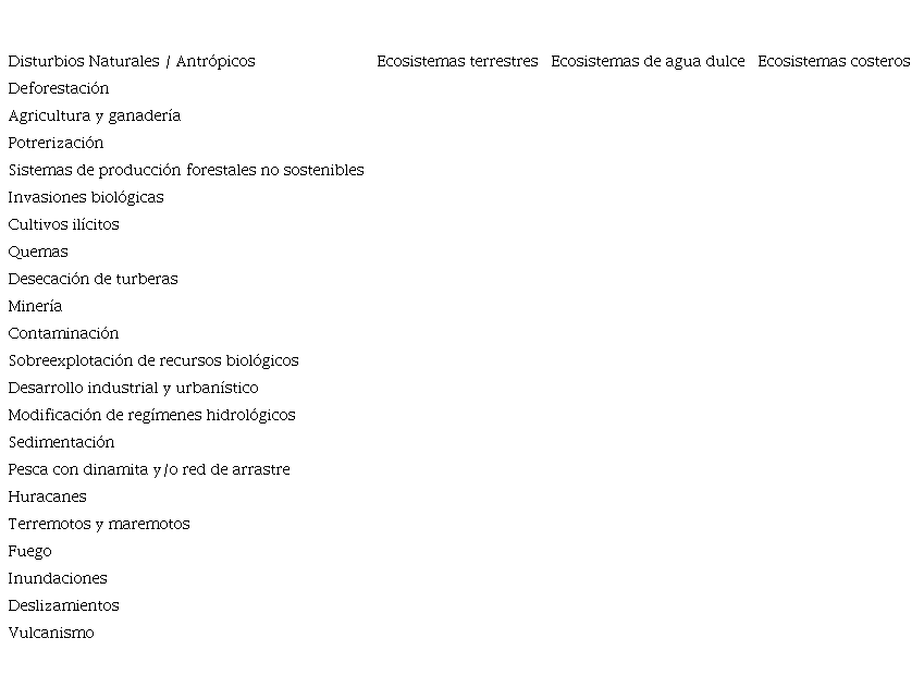 Este puede ser de origen natural (heladas, inundaciones, vulcanismo, etc.) o antrópicos (ganadería, agricultura, minería, deforestación, entre otros) (cuadro 1), en donde su dinámica espacial y temporal depende de la forma como estos interactúan con el entorno [1, p. 227]. La escala espacial establece la extensión del disturbio, la magnitud la fuerza del disturbio y la dimensión temporal la frecuencia y la predictibilidad del mismo, pudiéndose clasificar los disturbios como raros, frecuentes, recurrentes y continuos [1, p. 227].