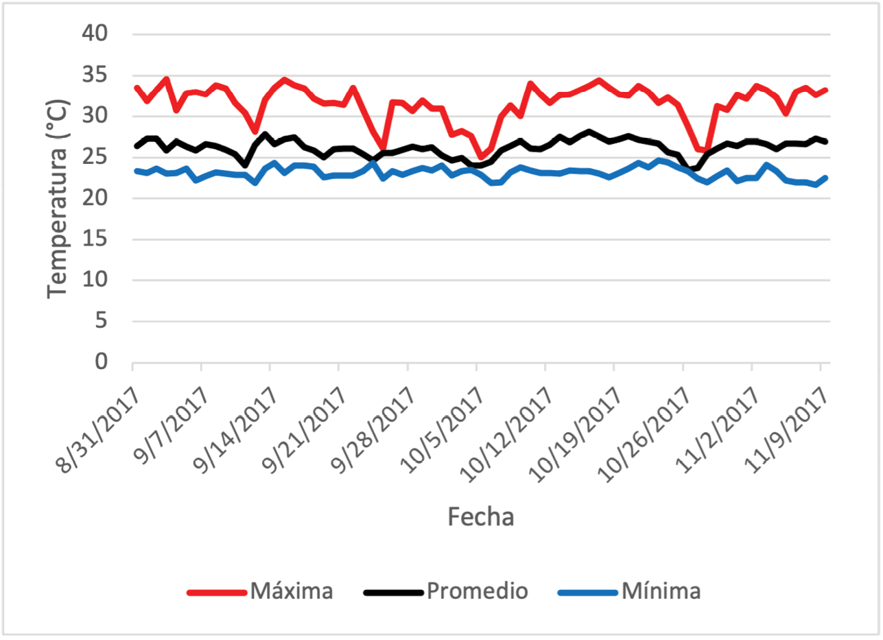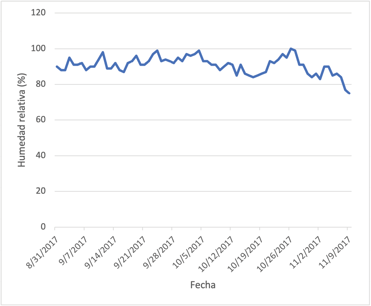 En las figuras 1 a 3 se presentan los datos de las variables climáticas en la zona del ensayo, durante el período de ejecución de la investigación. La precipitación pluvial acumulada durante el período del ensayo (1027,2 mm), al igual que las demás variables climáticas, fueron propicias para el desarrollo del cultivo.