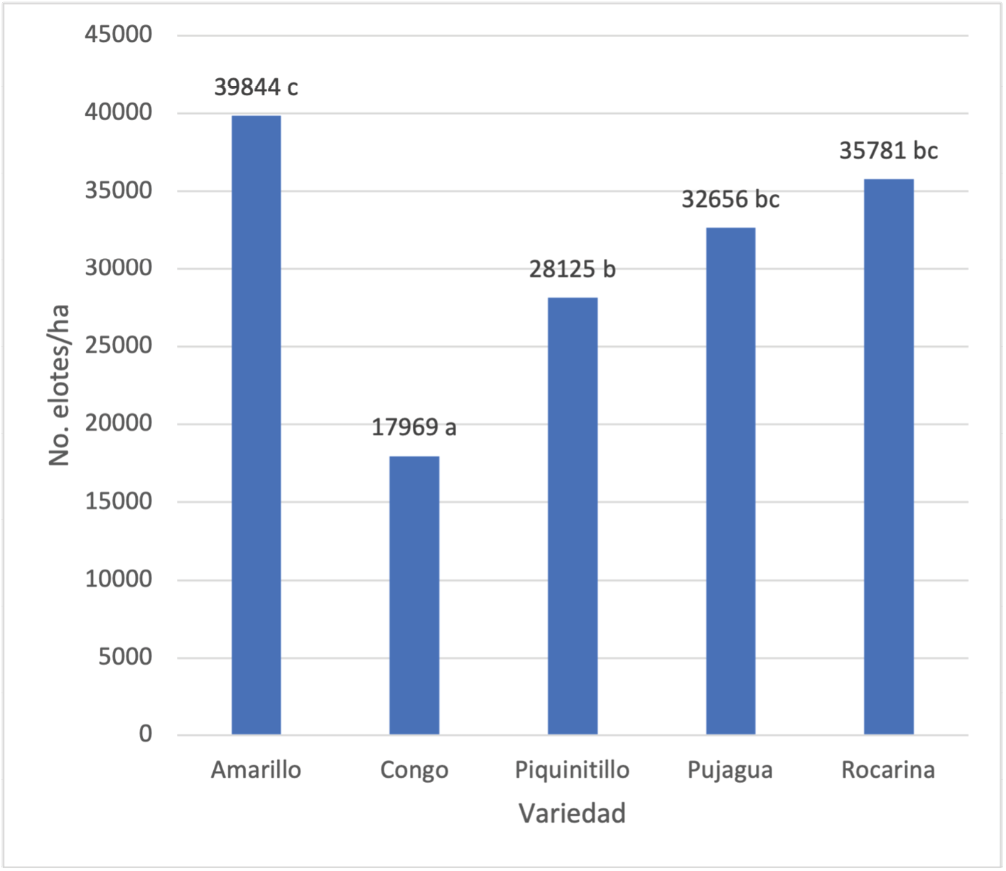 En la figura 6 se presenta el número promedio de elotes/ha, según la variedad de maíz nativo. La variedad Amarillo obtuvo un mayor número de elotes (39.844/ha), en comparación con las variedades Congo y Piquinitillo (17.969-28.125/ha), pero ese resultado fue estadísticamente similar al hallado para Pujagua y Rocarina. La variedad Congo obtuvo una producción de elotes significativamente inferior, en comparación con todas las demás variedades.