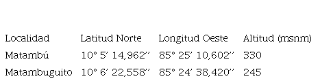 El ensayo se realizó en las localidades de Matambú y Matambuguito (cuadro 1), ubicadas en los cantones de Nicoya y Hojancha, Guanacaste, Costa Rica. Se utilizaron cinco variedades nativas de maíz (Zea mays L.), cuyos granos fueron caracterizados recientemente [23]: Pujagua, Piquinitillo, Congo, Rocarina y Amarillo; la semilla fue suplida por los agricultores de la zona.