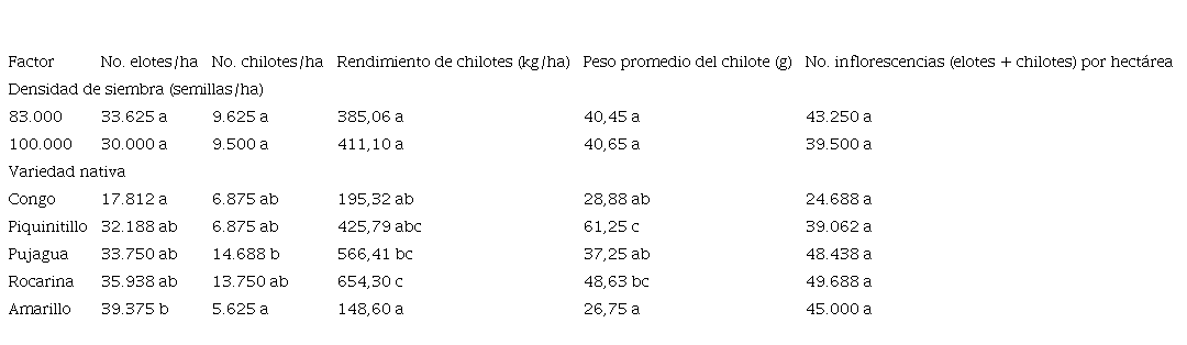 Al considerar el número total de inflorescencias femeninas inmaduras (elotes y chilotes), no hubo diferencias significativas ni entre las variedades nativas ni tampoco entre las densidades de siembra.