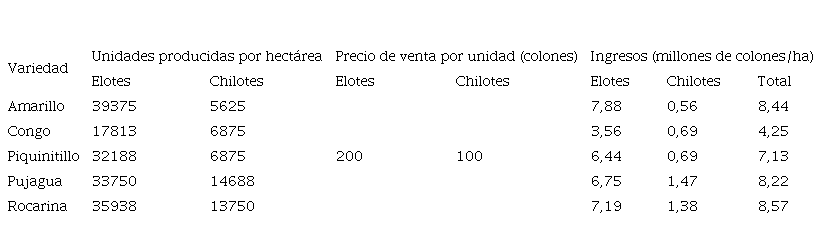 El mayor ingreso estimado por la venta de elotes y chilotes se obtuvo con las variedades Amarillo, Pujagua y Rocarina (8,22-8,57 millones de colones/ha), y el menor valor se halló con la variedad Congo (4,25 millones de colones/ha).
