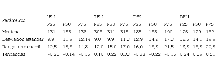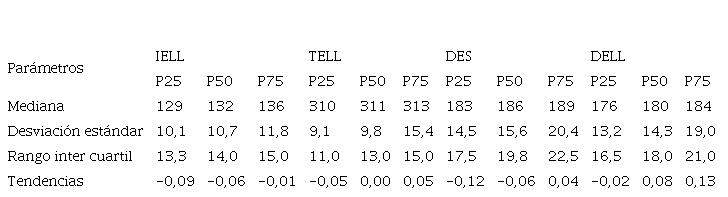 El cuadro 1 presenta un resumen numérico para las figuras 2, 3, 4 y 5 usando los percentiles 25, 50 y 75 (P25, P50 y P75, respectivamente), permitiendo una visualización clara de los valores medios de cada figura y los umbrales entre los cuales se encuentra el 50% de los datos en cada fecha (IELL, TELL, DES, DELL) de la región.