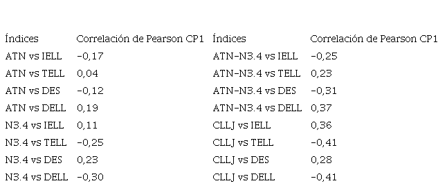 Para comparar las CP asociadas al IELL, TELL, DELL y DES con los índices de variabilidad climática se calcularon entre ellos sus correlaciones de Pearson y se llevó a cabo una prueba t-student de dos colas para evaluar su significancia estadística. Además también se aplicó el análisis de tablas de contingencia detallado por [28], donde se usa la función de correlación cruzada entre una variable dependiente e independiente, siguiendo las recomendaciones de [28] usando solo tres categorías divididas por terciles indicando condiciones bajo lo normal (BN), normales (N) y arriba de lo normal (AN). Finalmente, se evaluó la significancia estadística de este método con una prueba χ2 y una prueba de Montecarlo.