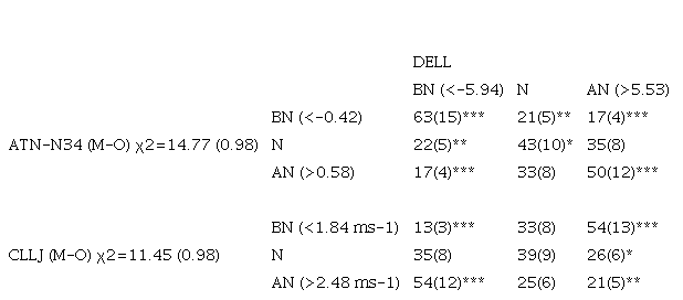 El cuadro 4 muestra los resultados del análisis de contingencia destacando solo las correlaciones entre la DELL y los índices ATN-N3.4 y la CLLJ dada la significancia estadística. Con respecto a la tabla de contingencia entre la DELL y ATN-N3.4 las categorías más probables son (BN, BN), (N, N) y (AN, AN) sugiriendo que un ATN-N3.4 bajo lo normal es más probable que propicie una DELL más corta, un ATN-N3.4 normal implica una DELL dentro lo normal y una ATN-N3.4 arriba de lo normal es probable que propicie una DELL larga. Por otro lado, la tabla de contingencia entre la DELL y la CLLJ muestra un comportamiento contrario donde las categorías más probables son (BN, AN), (N, N) y (AN, BN), esto implica que una CLLJ bajo lo normal (arriba de lo normal) propicia una DELL más larga, condiciones normales de la CLLJ sugieren DELL normales y una CLLJ arriba de lo normal es probable que propicie DELL cortas.