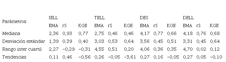 Se calcularon algunos parámetros estadísticos para caracterizar el comportamiento climatológico de los fenómenos en la región para el periodo de estudio. Estos fueron la media aritmética y mediana como medidas de localización y la desviación estándar y rango inter cuartil como medidas de dispersión. Además, se calcularon las tendencias mediante el método de mínimos cuadrados como una regresión lineal simple.