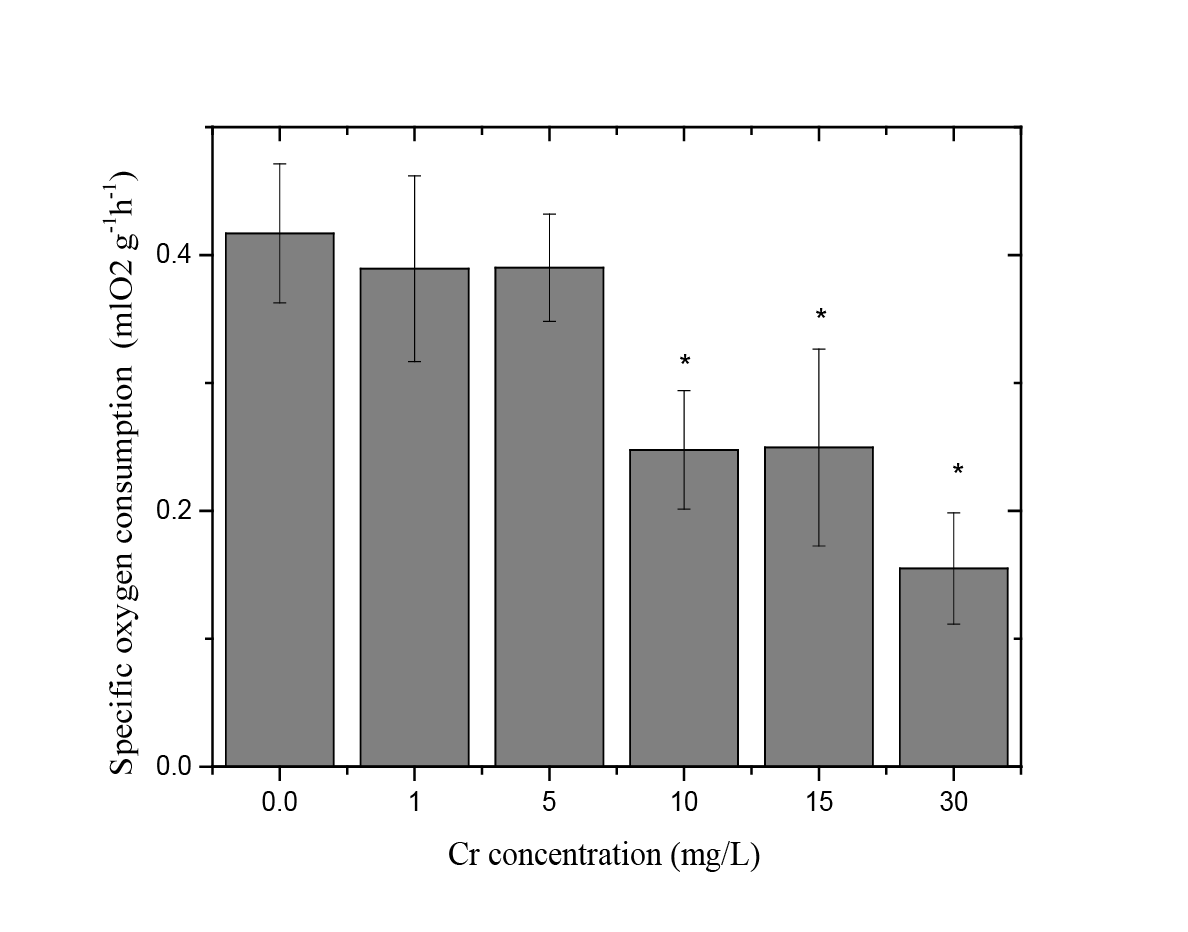 Se midió el consumo específico de oxígeno de juveniles de tilapia del Nilo (Oreochromis niloticus) que fueron aclimatados en peceras a una temperatura de 22 ºC para 5 diferentes concentraciones de cromo (VI). Los valores obtenidos representan una disminución en el consumo de oxígeno de 6.62, 6.41, 40.60, 40.14 y 62.81 % de la medición del grupo control. El cuadro 1 muestra la determinación del consumo de oxígeno en mL/g/h de tilapia del Nilo (Orechromis niloticus) expuesta a concentraciones de cromo (VI) de 0.0 (control), 1.0, 5.0, 10.0, 15.0 y 30.0 mg/L, en respirómetros a una temperatura de 22 oC por un tiempo de 4 horas.