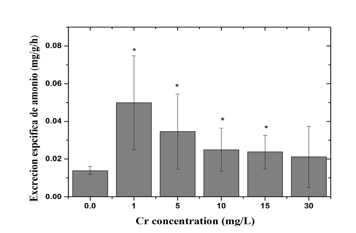 Se midió la excreción de amoníaco de tilapia del Nilo (Oreochromis niloticus) de peces que fueron expuestos en peceras con cromo (VI) (cuadro 2), en concentraciones de 1.0, 5.0, 10.0, 15.0 y 30.0 mg/L. Los resultados obtenidos para la excreción de amoniaco con diferentes concentraciones de Cr6+ mostraron un aumento en la excreción cuando los especímenes se expusieron a 1.0 mg/L de cromo, en comparación con el grupo control. El aumento en la excreción de amoníaco fue de 3.56 veces mayor que el grupo control (cuadro 2). Para las concentraciones de 5.0, 10.0 y 15.0 mg/L de cromo (VI) la diferencia en la excreción de amoníaco fue de 2.47, 1.79 y 1.69 veces mayor, respectivamente; mientras que para la exposición a 30 mg/L fue de 1.51 veces mayor comparada con el grupo control.