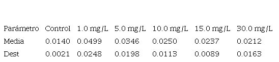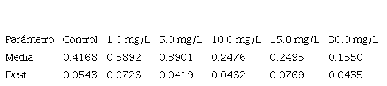En el cuadro 2 se puede observar la determinación de la excreción de amoníaco en mg/g/h en tilapia del Nilo (O. niloticus) expuesta a diferentes concentraciones de cromo (VI) de 0.0 (control), 1.0, 5.0, 10.0, 15.0 y 30.0 mg/L, en respirómetros a una temperatura de 22 oC por un tiempo de 4 horas.