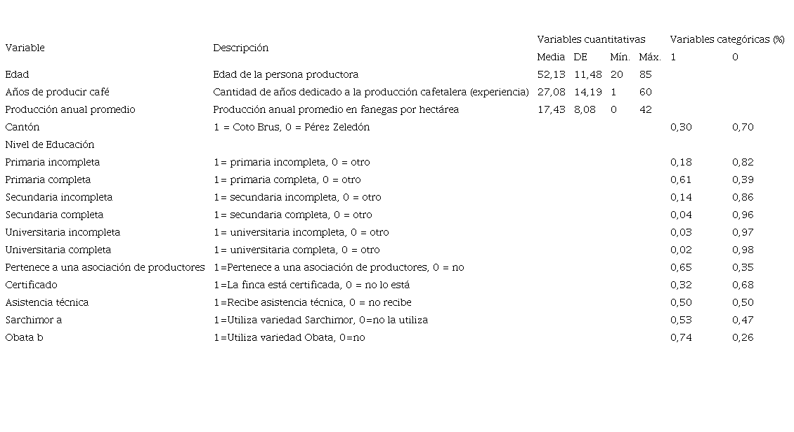 Antes de la aplicación de la encuesta, esta fue validada en campo y aprobada por el Comité Ético Científico de la Universidad de Costa Rica, donde se corroboró el cumplimiento de las buenas prácticas de ética y el consentimiento informado de las personas productoras para su partición libre en la investigación. Para la recolección de datos primarios en campo, fue muy importante la participación de agrupaciones de personas productoras y el Ministerio de Agricultura y Ganadería (MAG) de la Región Brunca para obtener las bases de datos de las personas cafetaleras de la zona de interés. Se calculó una muestra de 192 personas caficultoras (135 de Pérez Zeledón y 58 de Costo Brus) y la información fue recolectada en el mes de agosto del 2021 mediante visitas a finca por un equipo de 5 personas capacitadas.