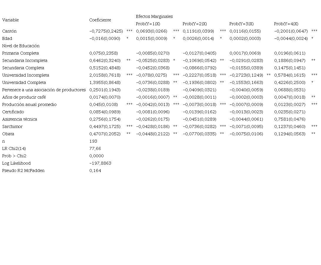 Resumen: La adopción de tecnologías agrícolas se promueve como alternativa para aumentar la productividad de los sistemas agroalimentarios, mejorar la seguridad alimentaria, mejorar los ingresos de las personas productoras y adaptar los sistemas productivos a los desafíos del cambio climático. A pesar de todos estos esfuerzos la adopción de tecnología es baja en algunas regiones. Esta investigación se enfocó en la identificación de los factores críticos que inciden en la adopción de tecnología en personas productoras de café en la Región Brunca de Costa Rica. Utilizando el índice de adopción de tecnologías para la región, se generaron clústeres que fueron utilizados como variable dependiente para el desarrollo de un modelo probit ordenado. La recopilación de información de campo se realizó mediante visitas durante el mes de agosto de 2021 para un total de 192 fincas caficultoras. Los resultados muestran que las variables determinantes en la adopción de tecnología son la edad, la ubicación geográfica, el nivel de producción anual promedio en fanegas por hectárea, la educación, los años de producir café y las variedades utilizadas (Sarchimor y Obata).