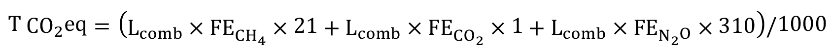 donde T CO2 eq son las toneladas de CO2 equivalente, Lcomb es la cantidad de combustible (gasolina o diésel) en litros, FEgas es el factor de emisión del GEI (cuadro 2)[5].