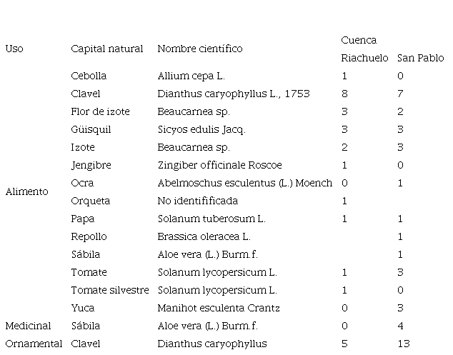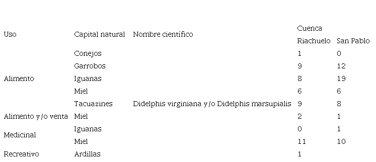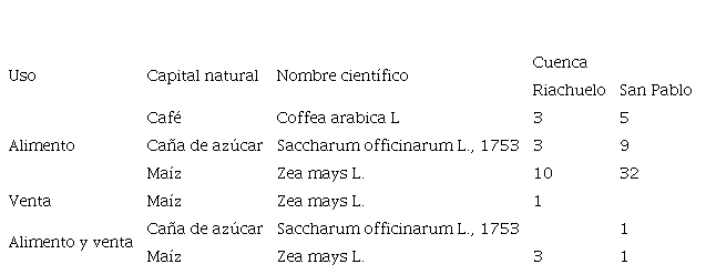 El uso de capitales naturales, especialmente de origen vegetal, es de gran importancia para las comunidades de ambas cuencas. Los frutos, semillas y hierbas son los recursos naturales más utilizados por estas comunidades. Estos recursos desempeñan un papel crucial en la alimentación de las familias, así como en actividades económicas y medicinales. Por lo tanto, la conservación de estos recursos es fundamental para garantizar la seguridad alimentaria, la salud y el bienestar de las comunidades rurales del área de estudio.