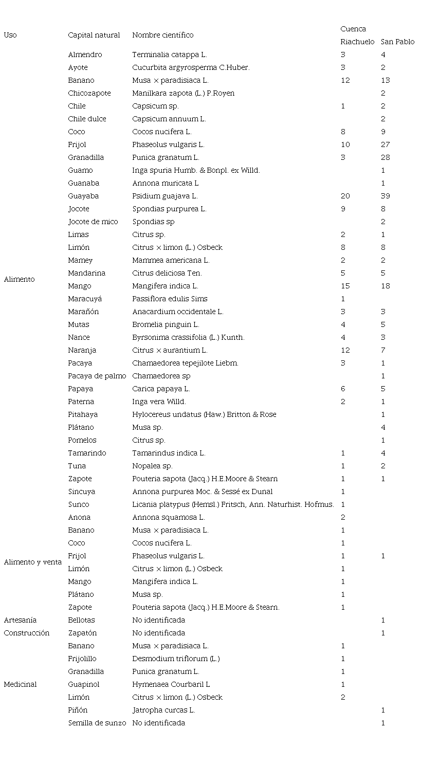 Por otra parte, la mayor parte de los capitales naturales que son frutos y semillas se emplean en como fuente de alimentación para las comunidades estudiadas (Cuadro 2). Los bananos, el frijol, la guayaba, los mangos, jocotes, limones y naranjas son reconocidos por numerosas familias como importantes alimentos en su dieta. Los datos muestran que muchas familias además de consumir estos frutos y semillas las venden como parte de sus actividades económicas y otras son empleadas con fines medicinales. Cabe resaltar que varios de estos recursos no son nativos (y que pueden considerarse como alimentos cultivados), pero se incluyeron en esta discusión pues son recursos que creen en ambientes naturales y que forman parte del entorno natural de los comunitarios.