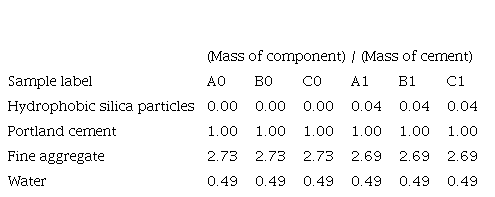 Each sample was formulated with Portland cement Type I, distilled water and fine aggregates A, B or C. Samples A0, B0 and C0 contained no hydrophobic silica particle, whereas samples A1, B1 and C1 were formulated with them. Table 3 summarizes these preparations.