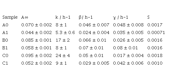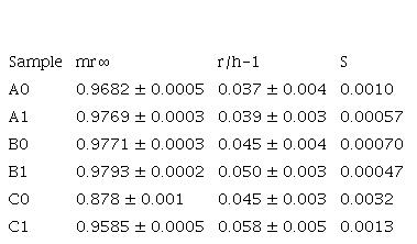 Continuous curves represent the modeling function of Equation 4, obtained on non-linear fit with the algorithm of Levenberg and Marquart. Summations of equation 4 were restricted to 100 terms each to accelerate the calculations.