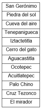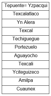 Inicia con el listado de 12 topónimos divididos entre parajes registrados en idioma náhuatl (6) y otro tanto en castellano (6). En ambos casos, se trata de un recuento del marco topográfico de Xicalco que nos habla de prácticas religiosas —Cruz Tezonco—, rituales —cueva del aire—, y culturales —Acuitlatepec—; por mejor decir, nos advierte de una apropiación simbólica del territorio que hunde sus raíces en la etapa inmediata anterior a la presencia hispana en este territorio y se prolonga con éxito al resto del siglo XVI y primera mitad del XVII (véase Cuadro 1 en el Anexo).