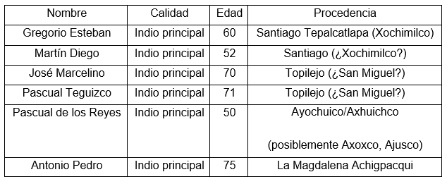 Los seis testigos presentados se manifestaron a favor de la “posesión inmemorial” de las tierras por parte de los indios de Xicalco.[57] Las edades de los deponentes oscilaban entre los 50 y 75 años. Si confiamos en el registro documental, el primero testigo había nacido a finales de la centuria, mientras el más viejo hacia el último cuarto del mismo siglo; es decir, todos ellos estaban en posibilidad de dar fe con su testimonio de vista cómo los naturales de Xicalco habían poseído la tierra desde antes de la presencia hispana en este territorio. Además, para mayor certeza de lo dicho, todos los declarantes procedían de asentamientos vecinos a Xicalco como San Miguel Topilejo, Santiago Tepalcatlapa o la Magdalena Achigpacqui (¿Petlalcalco?) (véase Cuadro 2 del Anexo.). Es decir, se trataba de indios habitantes de estancias con una historia temporal similar a la de Xicalco que difícilmente reconocerían la posesión en caso de afectar a sus lugares de origen.