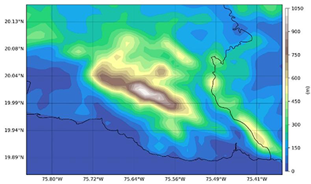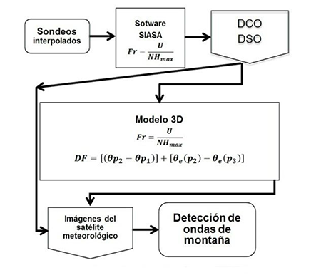 Para la detección de las ondas de montaña se utilizó un modelo numérico 3D, con ajuste dinámico en los campos meteorológicos de interés para esta investigación, que incluye los efectos provocados por la complejidad del terreno, además del número de Froude. El modelo está basado en los pronósticos numéricos inmediato en el dominio de un kilómetro de resolución espacial, el cual se extiende entre los 19.0 - 21.0 N y los 74 -76.0 W que cubre el área de estudio. Las ecuaciones del movimiento vertical se consideraron en equilibrio hidrostático, limitante para el caso de altas resoluciones espaciales, pero se resolvió con la estrategia de integración numérica que se diseñó, (Morfa 2016).