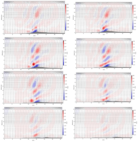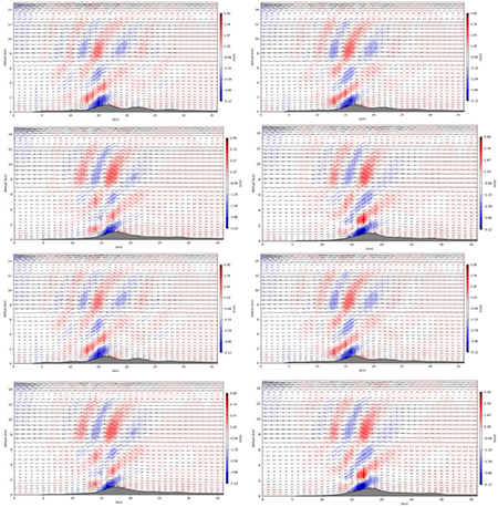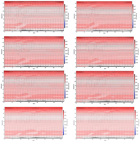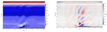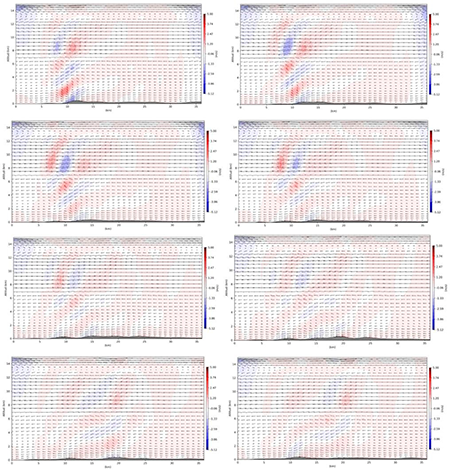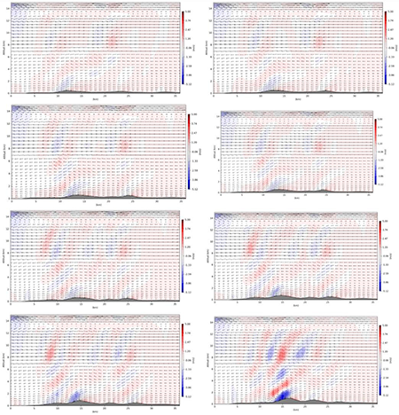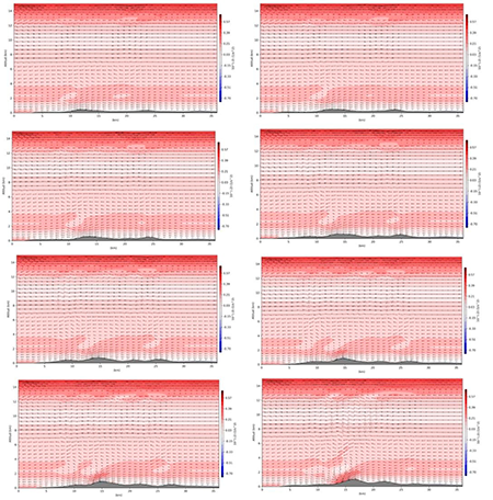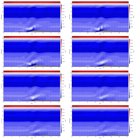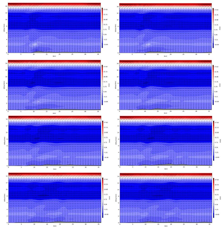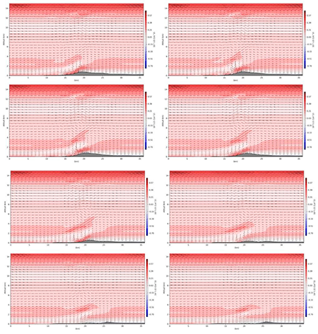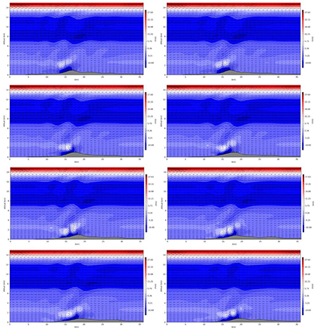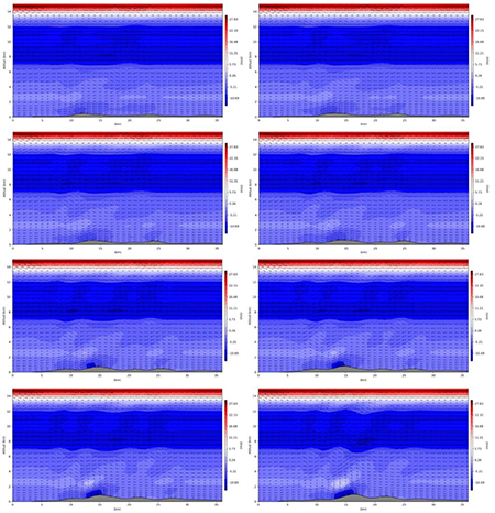 Los cortes horizontales y verticales de la atmosfera muestran en dichos mapas la presencia de ondas de montaña. Hay que señalar que las condiciones de fronteras se consideraron fijas en el tope del modelo, lo cual trajo como consecuencia una reflexión total de las ondas hacia abajo en el dominio, apreciándose un patrón de interferencia entre las ondas que se propagan hacia arriba y las reflejadas, lo cual se puede observar en el mapa del corte de la velocidad vertical de la atmósfera (Figura 8b).