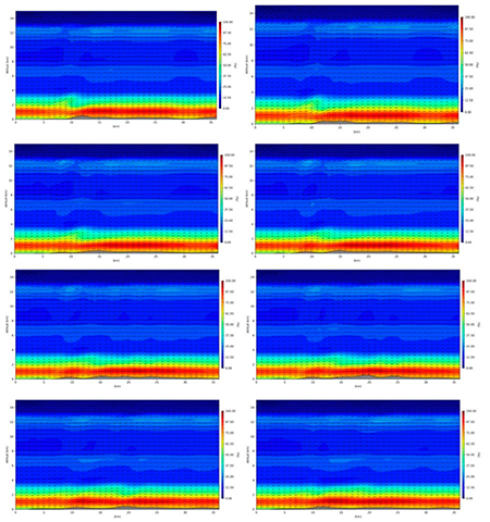 De las simulaciones realizadas se obtuvieron mapas de altura del terreno, del Duct factor, así como, los cortes verticales en dirección Sur-Norte de las variables: velocidad horizontal (v), velocidad vertical (w), cuadrado de la frecuencia de Brünt-Väisala (N2) y humedad de la relativa (Hr). La inicialización se realizó con los datos del modelo WRF de las 1200 Z generándose ondas lineales de montaña tres horas después.