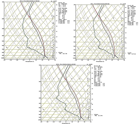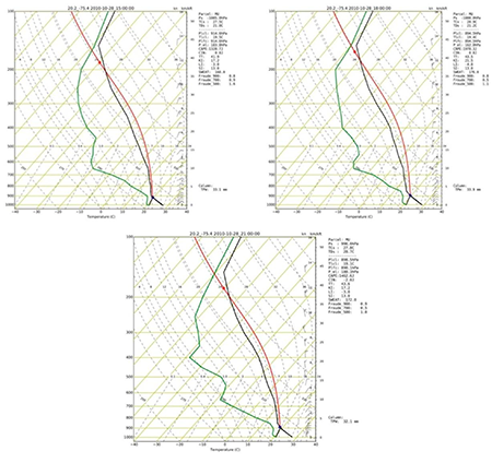 Localizados los días con la posible ocurrencia de ondas de montaña, se procede a analizar las condiciones dinámicas y termodinámicas de un caso identificado, el 28 de octubre de 2010. Los sondeos interpolados de la atmosfera de ese día muestran una parcela de aire ligeramente inestable, con valores de la CAPE moderado y humedad relativa presente en las primeras capas de la atmosfera en los horarios de las 15, 18 y 21 UTC (Figura 4). El resto de los indicadores no revelaron la posibilidad de actividad convectiva intensa, mientras que, los valores de Fr estuvieron entre 0.80 y 0.90, cercano a la cima de la montaña.