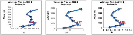 Conforme a la altura de la montaña escogida para esta investigación, se probó que el número de Froude en muchos de los casos no superó el umbral encontrado en la literatura consultada. En este caso se obtuvieron valores de Fr entre 0.50 y 1 (Figura 5) en los tres horarios, demostrando que pueden presentarse ondas de montaña en el área de estudiada, confirmando lo hallado en la literatura para obstáculos tridimensionales de Smolarkiewicz, y Rotunno (1989) y Smith (2004).