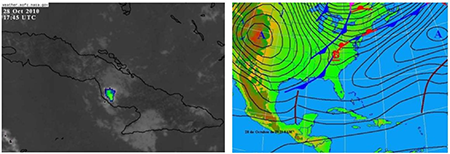 El entorno sinóptico muestra un centro de altas presiones sobre el noroeste del océano Atlántico, extendiendo su dorsal hacia el norte de las Bahamas, influyendo sobre la mitad oriental del Golfo de México y el Mar Caribe, el cual generó condiciones de tiempo estable sobre Cuba, y vientos de región nordeste (Figura 9b), condición favorable para la génesis de ondas.
