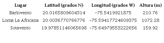 Con el fin de cubrir la Región de estudio se seleccionaron las coordenadas y las alturas a través de sitio web http://www.altitude.nu/, (Tabla 1), sitio interactivo para obtener mapas con datos de elevación y topográficos.